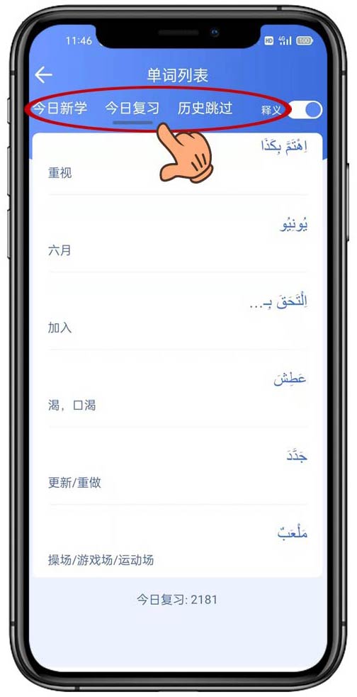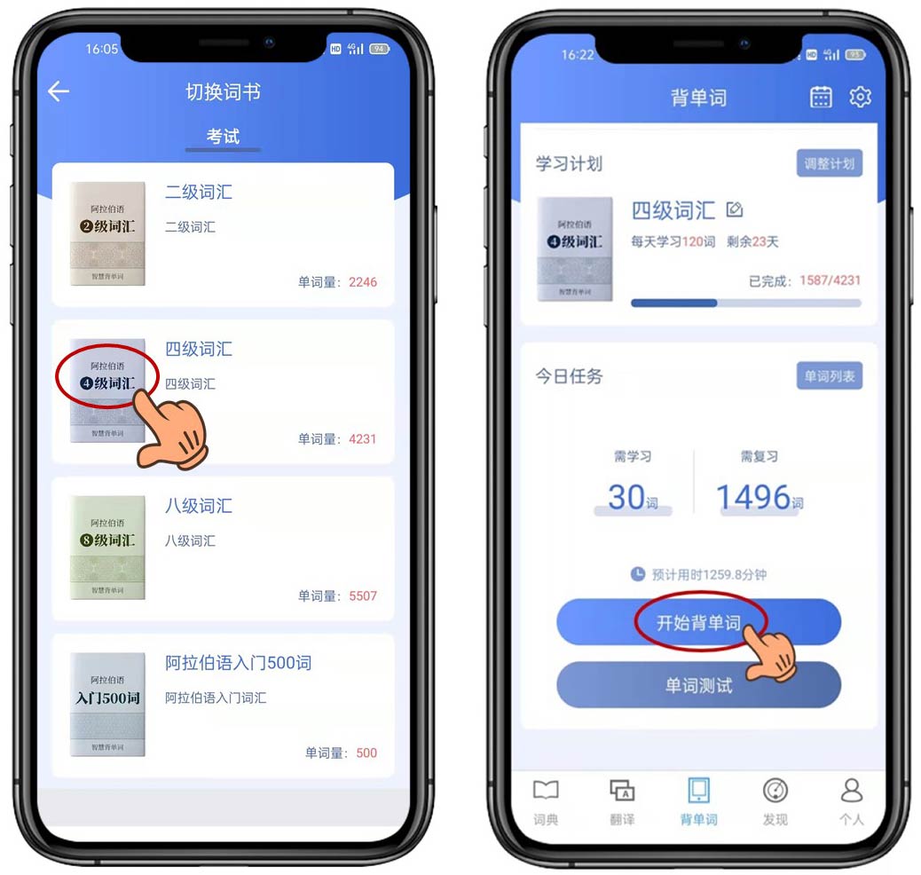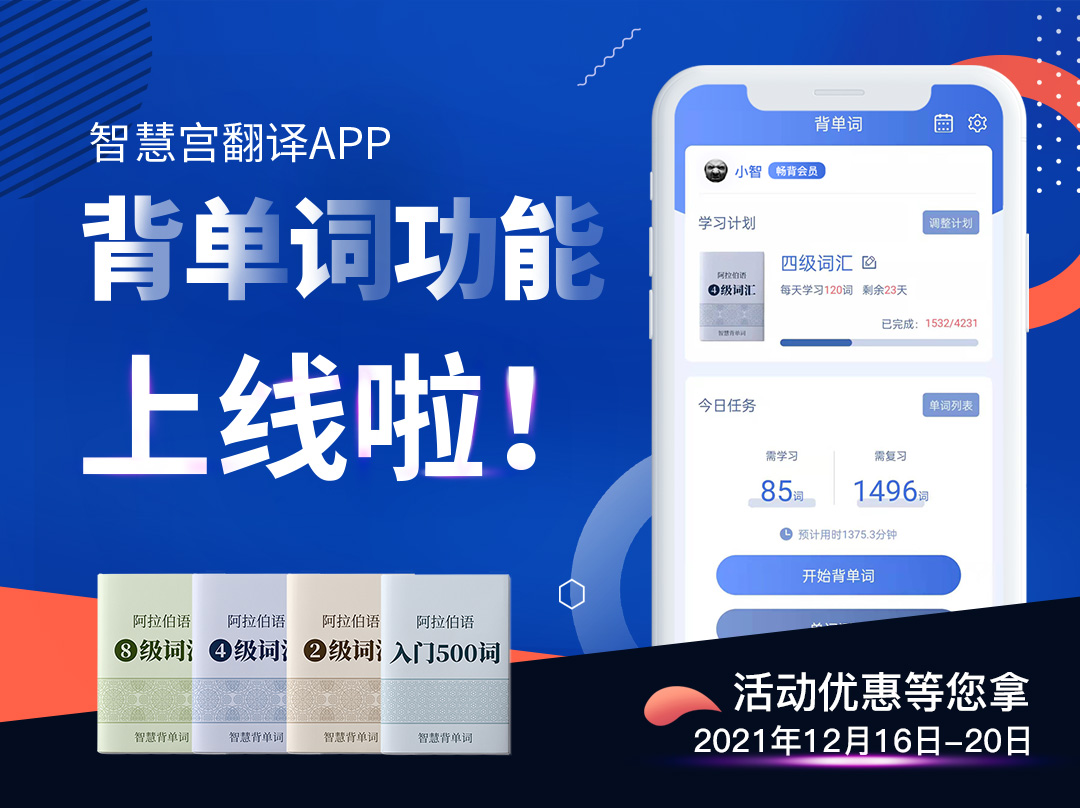 目前,智慧宫翻译APP背单词功能中词书内容涵盖了《阿拉伯语二级词汇》《阿拉伯语四级词汇》《阿拉伯语八级词汇》和《阿拉伯语入门500词》,您可以在切换词书栏里选择适合您的词书。各类新词书也将会陆续上线与您见面。