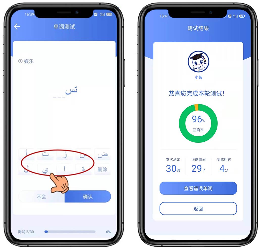 比起在迷雾中学习,测试可以让您更好地认清自己的现状,了解自己的真实水平。在测试中为了让您输入阿拉伯语字母更快捷,我们专门设计了虚拟键盘供您使用,测试结束后由系统为您分析测试结果,让您一目了然看到背记单词情况。