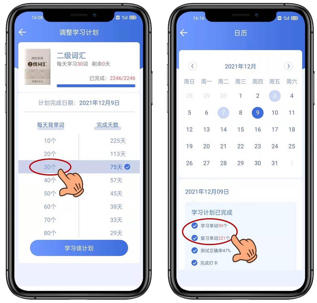 该功能可根据您所选择的背记单词进度,系统会精确计算出背记单词,成果和所用天数,通过日历功能可查看历史学习进度和测试结果,通过科学调整学习计划助力您达到事半功倍的效果。