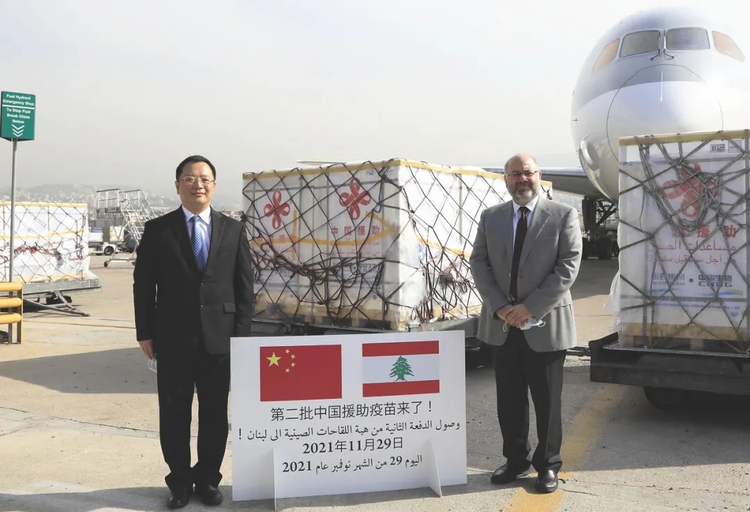 11月29日,中国援助黎巴嫩第二批新冠疫苗运抵贝鲁特。驻黎巴嫩大使钱敏坚和黎巴嫩公共卫生部长菲拉斯·阿卜亚德等出席交接仪式。