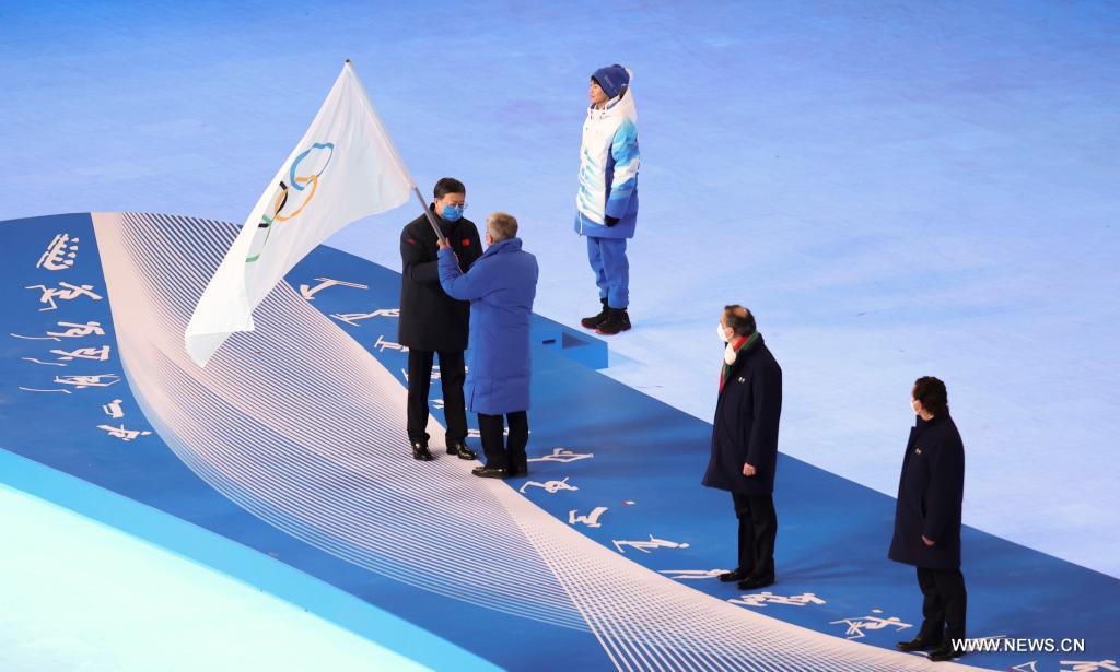 وسلم عمدة بكين تشن جي نينغ العلم الأولمبي إلى رئيس اللجنة الأولمبية الدولية توماس باخ، الذي سلمه بدوره إلى العمدتين.