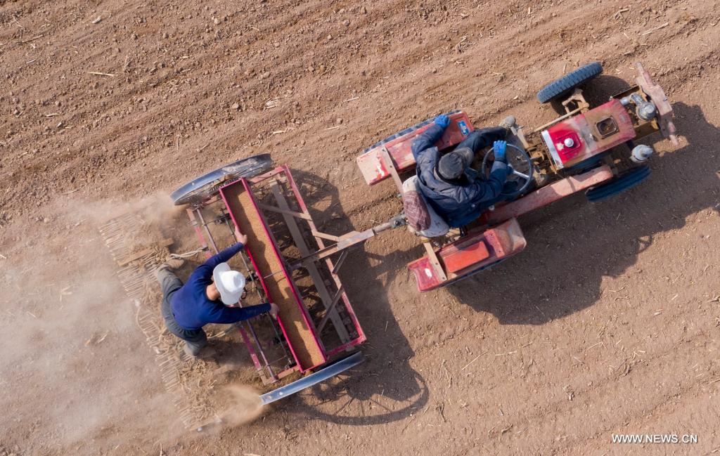 时下正值春耕备耕时节,宁夏吴忠市同心县的农民抢抓农时,播种小麦。