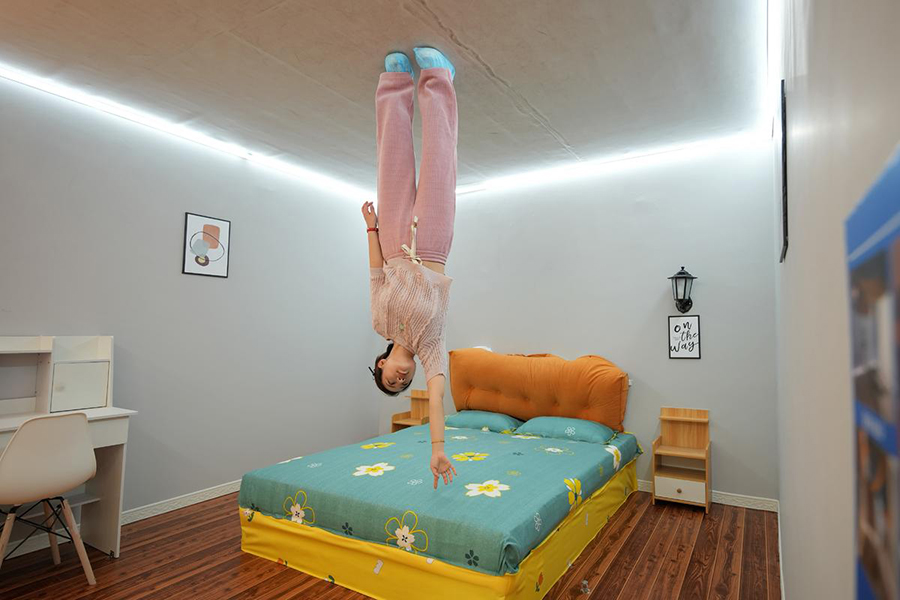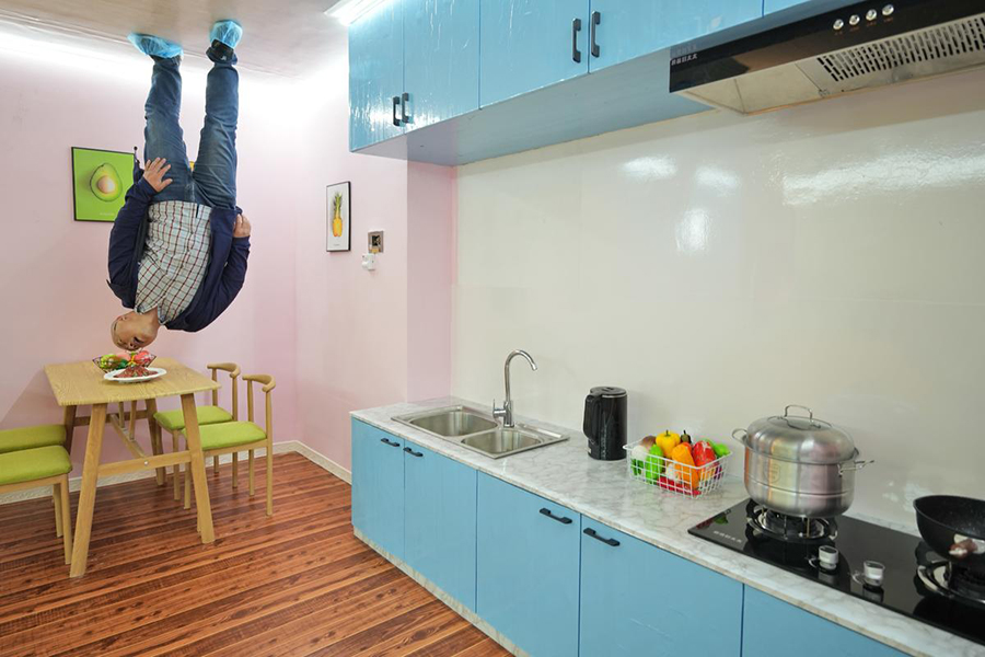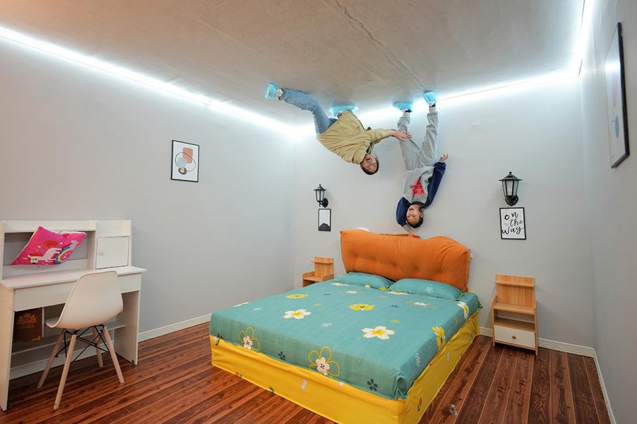 يانتاى،شاندونغ: تجربة "المشي على الأسقف والجدران" في "متحف مقلوب رأسا على عقب"