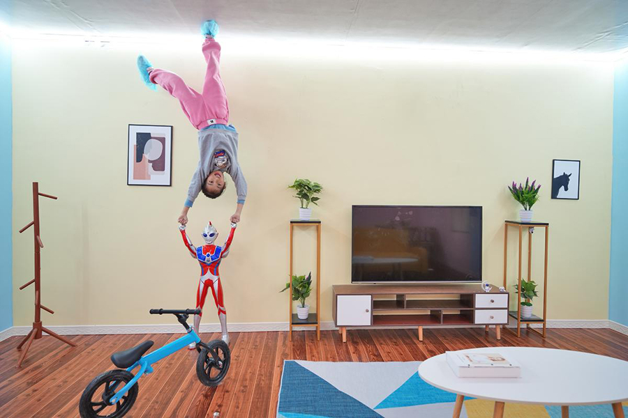 近日,山东烟台,游客在“颠倒博物馆”留下奇趣画面。当地一家名为“颠倒博物馆”的网红打卡地,游客们在上下颠倒的布景中“花式”拍照后,将照片倒置就能呈现出“飞檐走壁”“时空倒转”般的奇妙景象,令人惊喜不已。