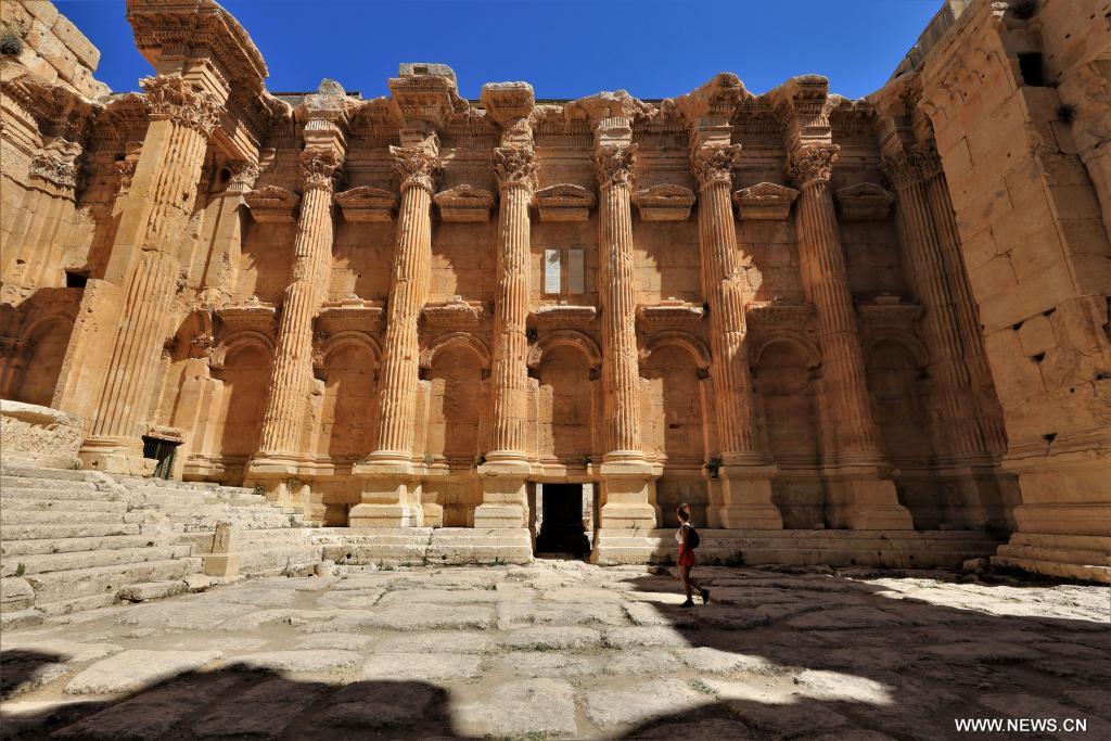 بيروت 27 يوليو 2023 (شينخوا) في الصورة الملتقطة يوم 26 يوليو 2023، سائحة تزور مجمع معابد بعلبك الأثري في مدينة بعلبك بلبنان، حيث تم تسجيل المجمع كموقع للتراث العالمي لليونسكو عام 1984.