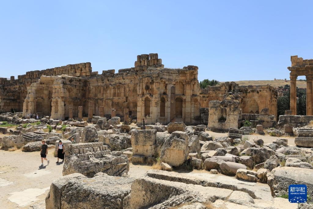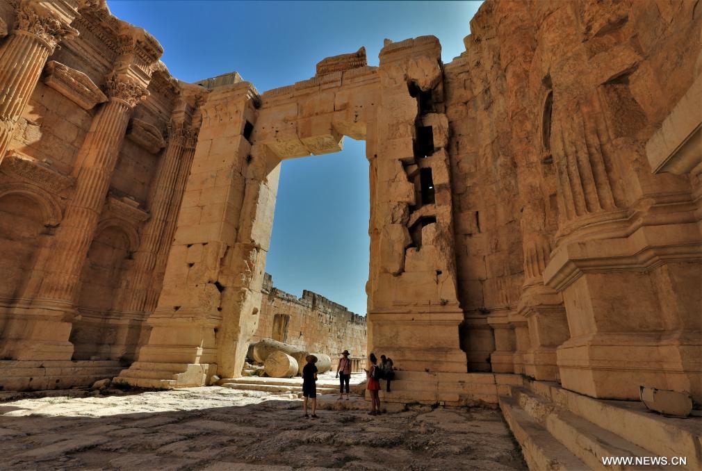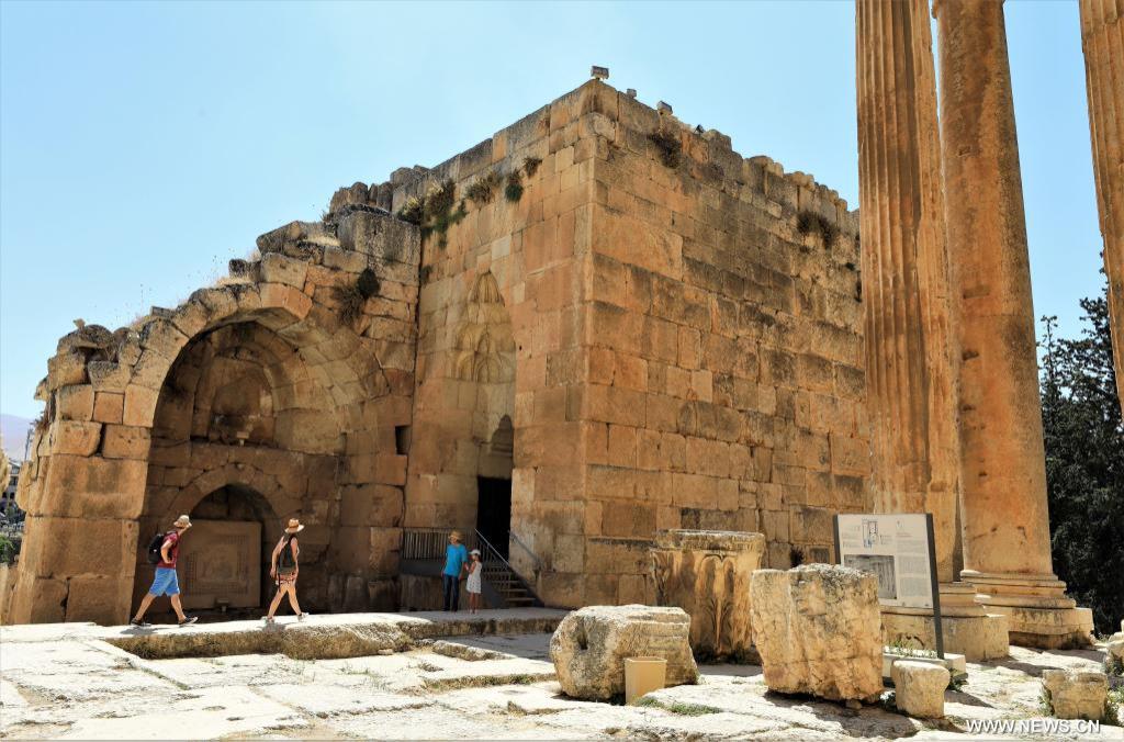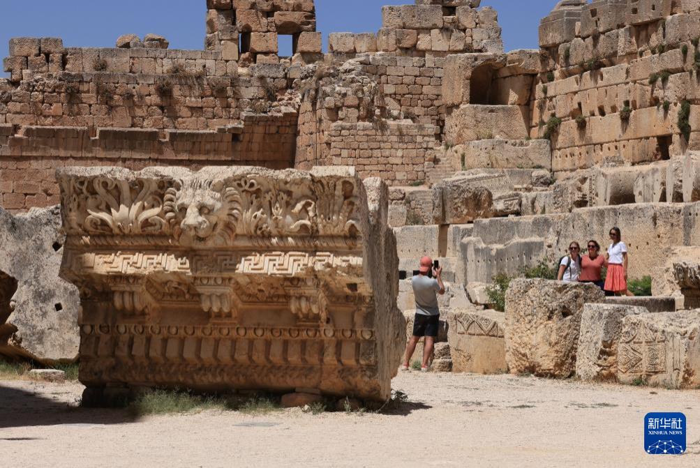 7月26日,在黎巴嫩巴勒贝克,游客在神殿建筑群遗址拍照留念。