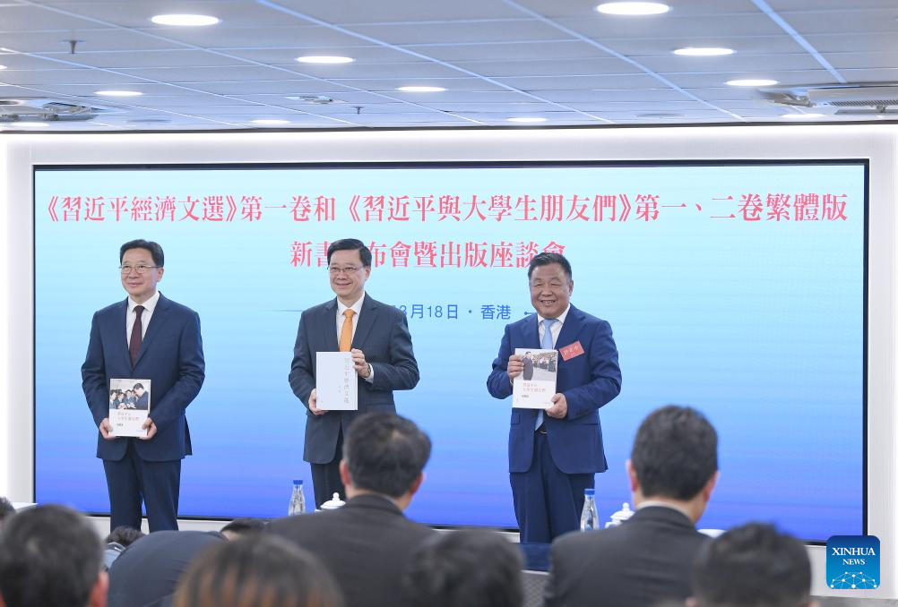 هونغ كونغ 18 مارس 2026 (شينخوا) ظهر المجلد الأول من سلسلة "الأعمال المختارة لـ شي جين بينغ بشأن الاقتصاد"، إلى جانب مجلدين من سلسلة "شي وطلاب الجامعات"، لأول مرة في هونغ كونغ، اليوم (الأربعاء).