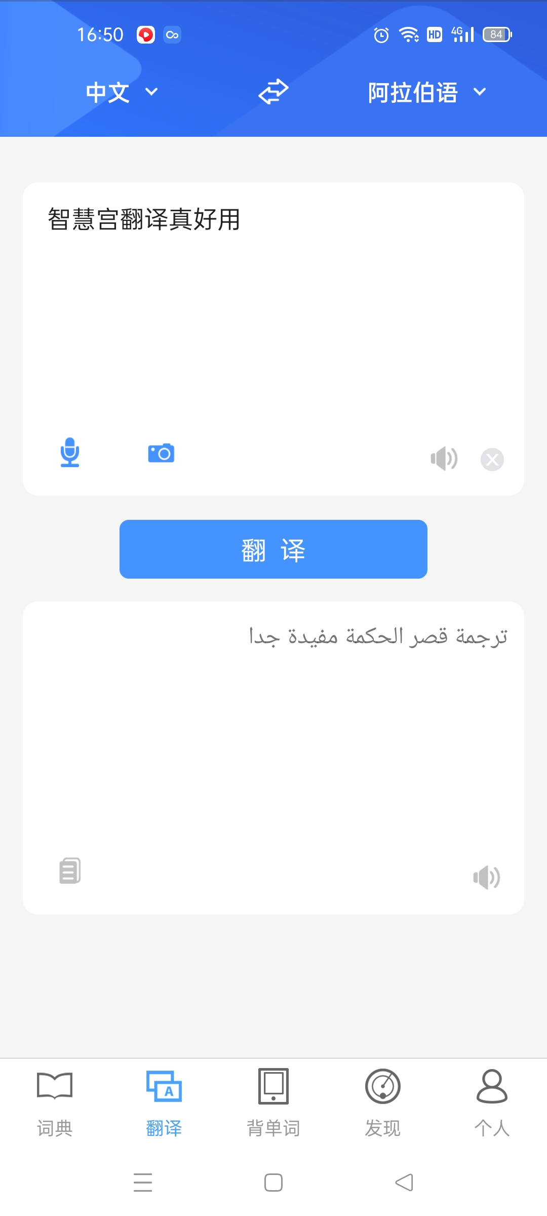 提供即时免费的中文、阿拉伯语在线互译服务。通过数据资源库比对、自然语言学习技术,使翻译结果更人性化。