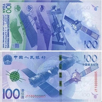 2015年中国发行的航天纪念钞也采用了正面横版、背面竖版的设计。
