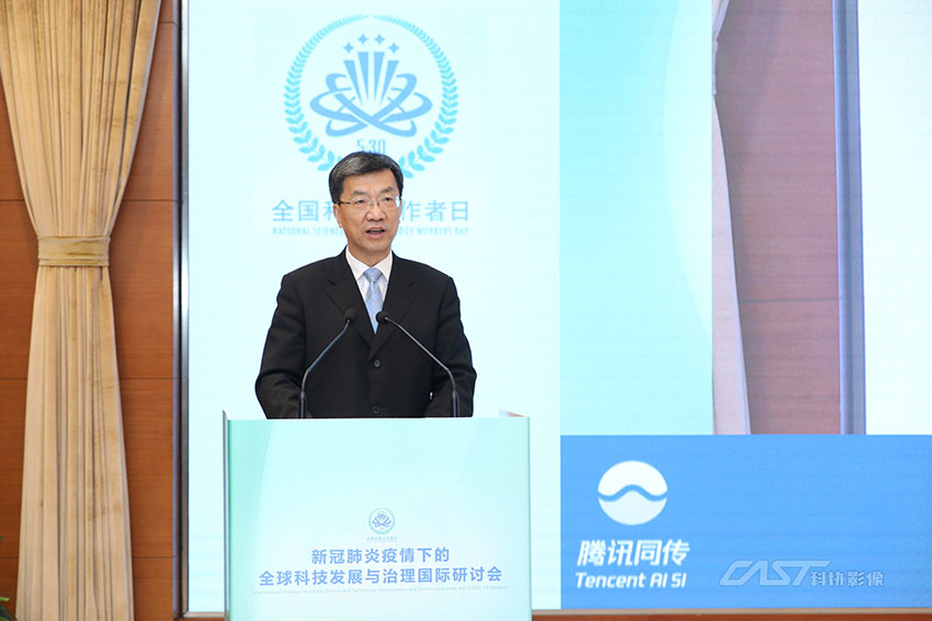 怀进鹏在致辞中提出,在第四个全国科技工作者日来临之际,习近平主席给科技界代表回信,强调创新是引领发展的第一动力,科技是战胜困难的有力武器。面对新冠肺炎疫情全球蔓延给世界人民生命安全和身体健康带来的威胁,增强团结信任是希望之光,各国科学家之间应增进理解互信,凝聚战胜疫情的强大合力;坚守科学理性是解危之策,坚持以科技创新有效应对重大传染性疾病等全球性挑战;推动开放合作是治理之道,各国科学家都应为构建人类卫生健康共同体不懈努力。他呼吁,世界各国应深化国际交流合作,共同维护全球公共卫生安全;促进科技创新发展,推动实现可持续发展目标;发挥科技组织作用,推动全球治理体系变革。他表示,中国科技界愿与世界同仁加强交流合作,以科技支撑可持续发展,共同佑护人类共有的地球家园。