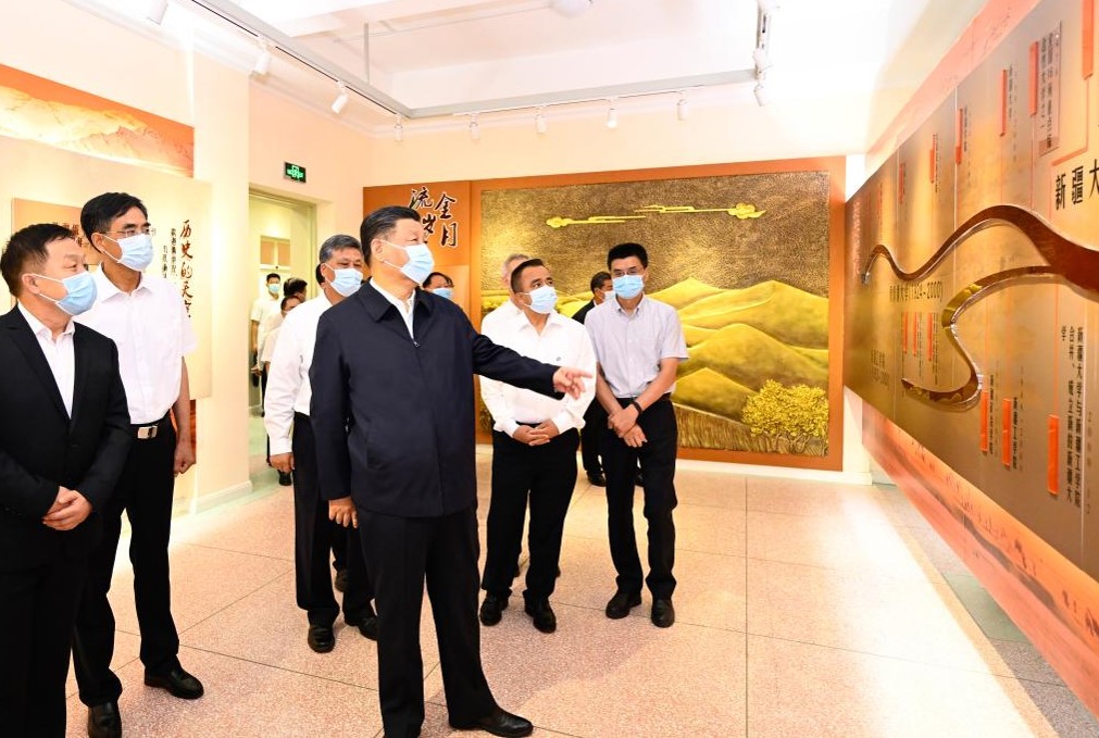 أورومتشي 14 يوليو 2022 (شينخوا) تفقد شي جين بينغ، الأمين العام للجنة المركزية للحزب الشيوعي الصيني، جامعة ومنطقة ميناء بري دولي ومجتمعا سكنيا ومتحفا في مدينة أورومتشي، حاضرة منطقة شينجيانغ الويغورية ذاتية الحكم شمال غربي الصين، في الفترة من بعد ظهر الثلاثاء إلى صباح الأربعاء.