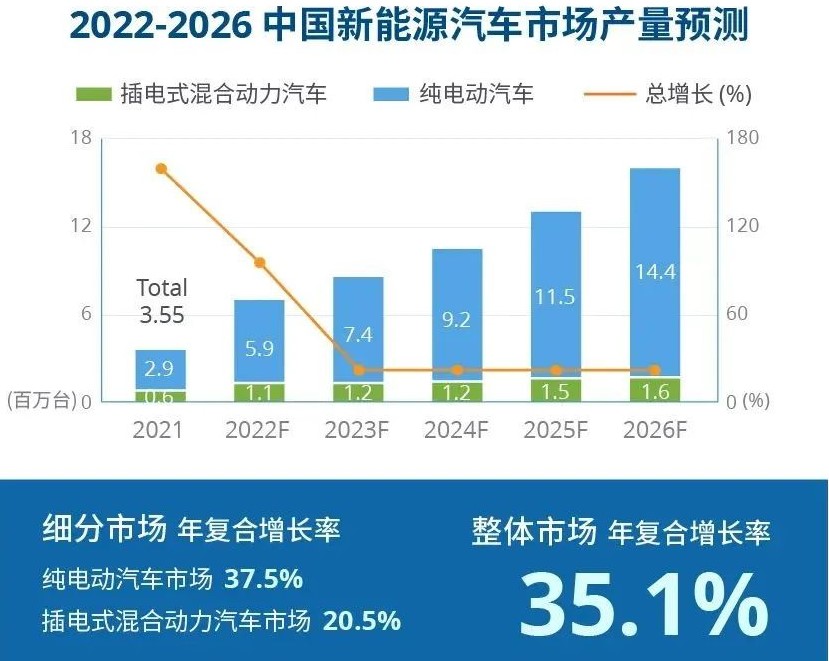 智通财经APP获悉,8月8日,IDC发布的最新报告《2022-2026中国新能源汽车市场趋势预测》显示中国新能源汽车市场规模将在2026年达到1598万辆的水平,年复合增长率35.1%。届时国内新能源车的新车渗透率将超过50%,保有量在整个汽车市场中的占比将超过10%。在全球范围内“减碳”的大背景下,汽车行业设定的目标是在2050年实现零排放,这要求各国在2035年停售传统燃油车。