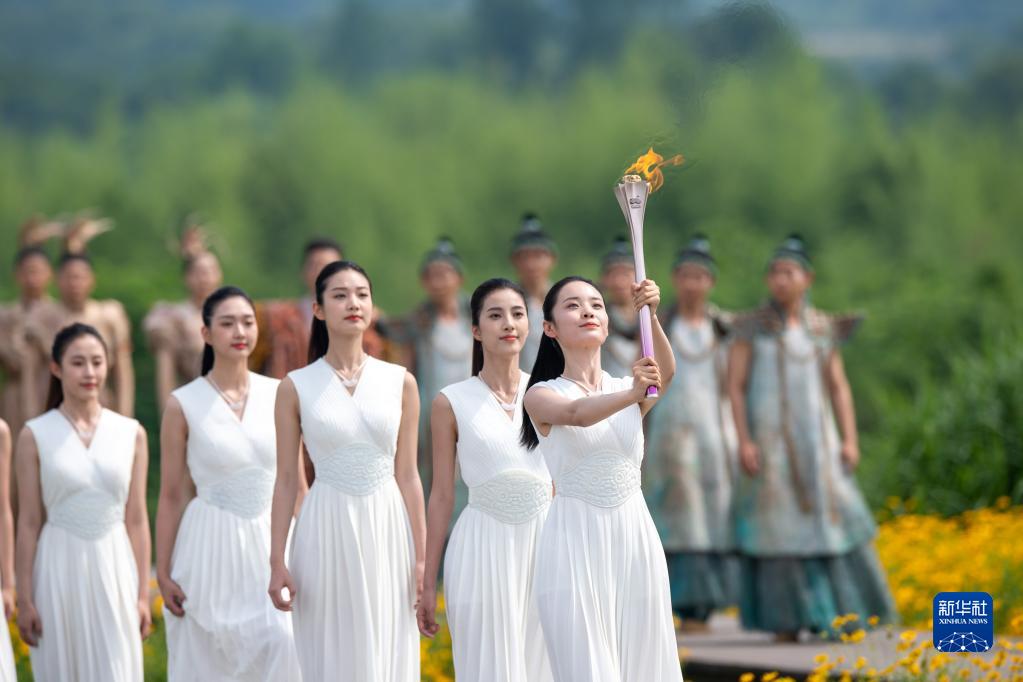 هانغتشو 15 يونيو 2023 (شينخوا) في الصورة الملتقطة يوم 15 يونيو 2023، مشهد لعرض الشعلة بعد إضاءتها خلال مراسم إضاءة شعلة دورة الألعاب الآسيوية (هانغتشو 2022) في الأطلال الأثرية لحديقة مدينة ليانغتشو في هانغتشو بمقاطعة تشجيانغ بشرقي الصين.
