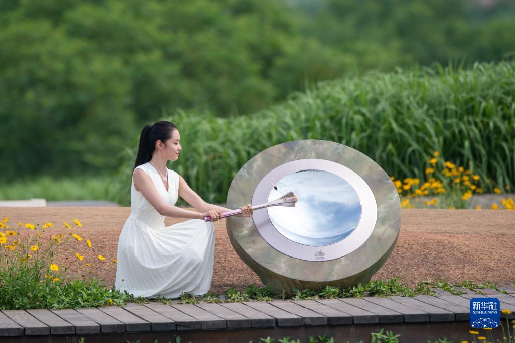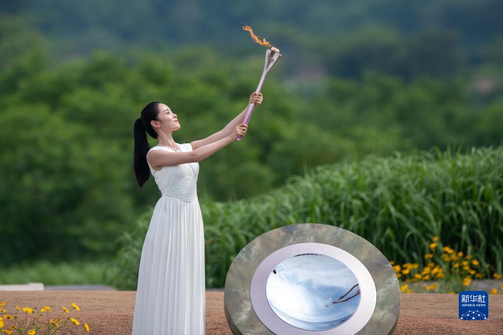 6月15日,采火使者展示圣火。当日,杭州亚运会火种采集仪式在浙江杭州良渚古城遗址公园举行。
