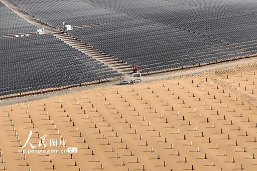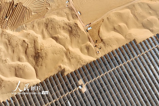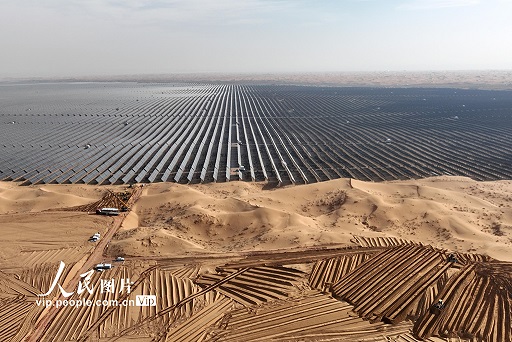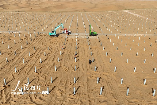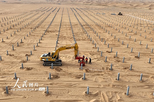 2023年12月9日,我国最大的“沙戈荒”风光基地项目——宁夏腾格里沙漠新能源基地中卫300万千瓦光伏复合项目二期200万千瓦现场,工人正在加紧施工。
