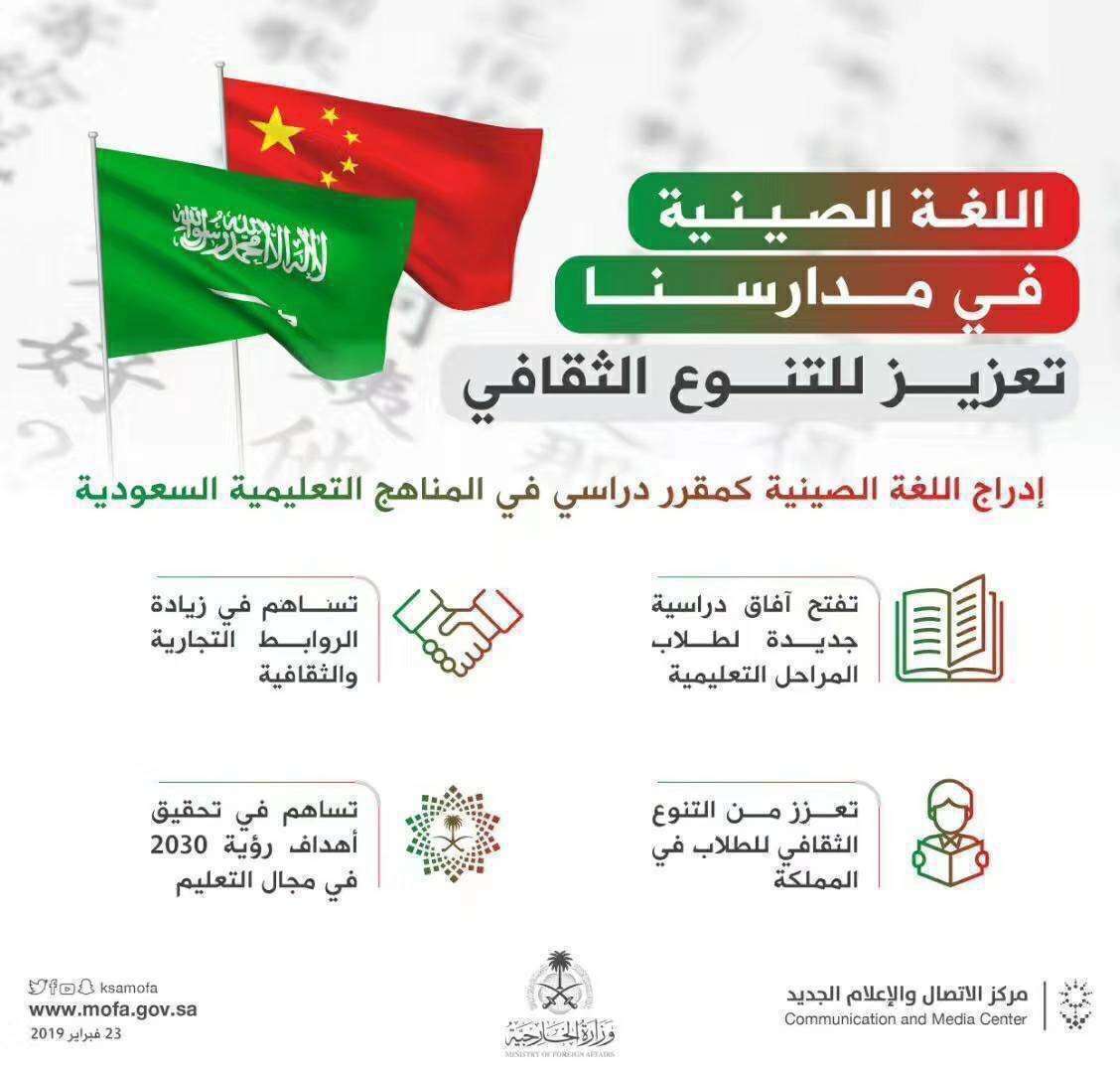 ففي ظل جهود تقوية علاقات الصداقة والتعاون بين السعودية والصين وتعميق الشراكة الاستراتيجية الشاملة على جميع المستويات، اتفق الجانبان على ضم اللغة الصينية إلى المناهج الدراسية في جميع المراحل التعليمية في المدارس والجامعات في المملكة العربية السعودية .