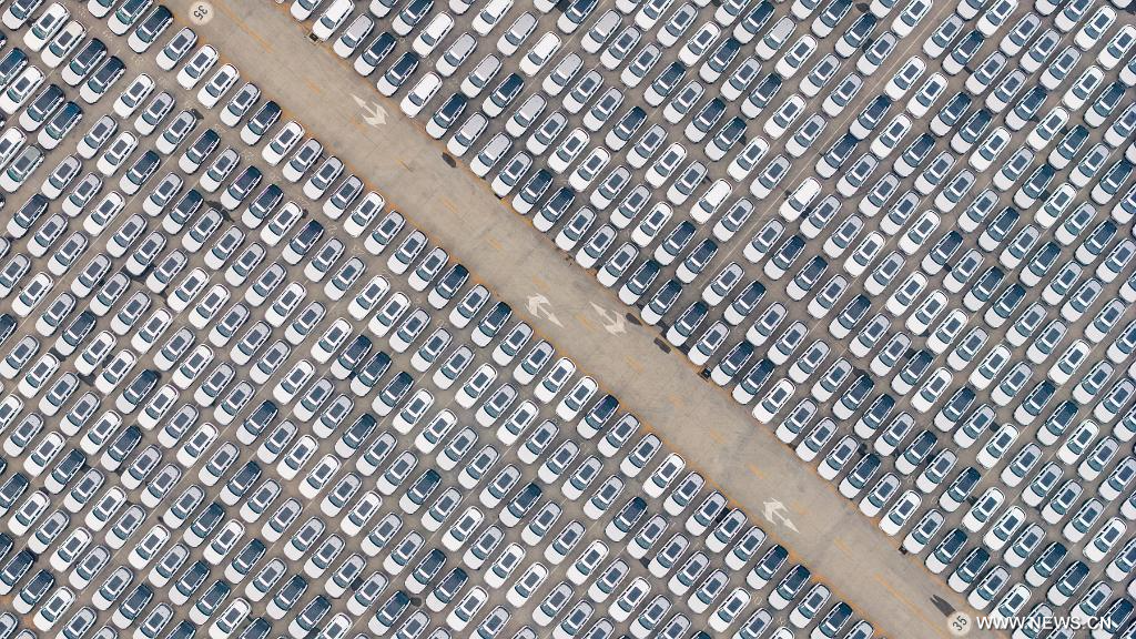 这是4月10日在天津港海嘉滚装码头拍摄的准备装船的国产汽车(无人机照片)。