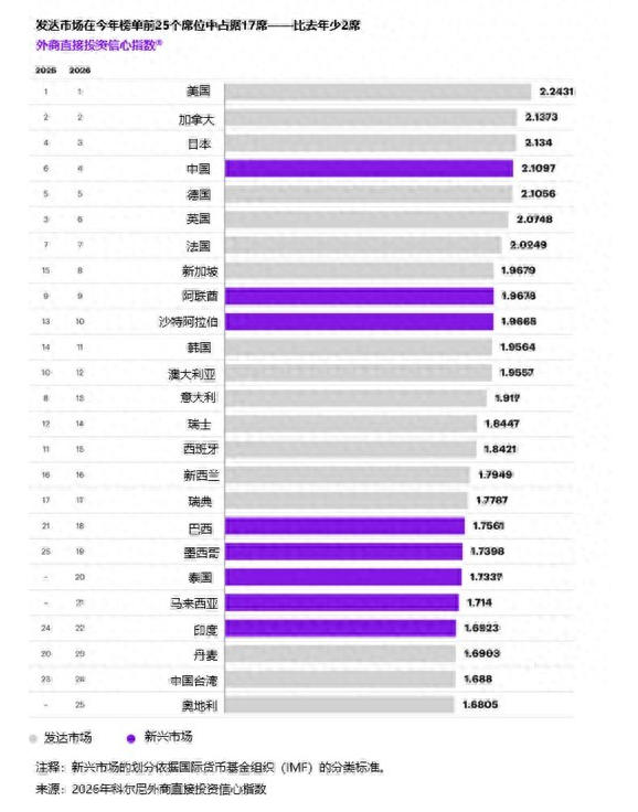 报告显示,在最新的全球外商直接投资信心指数排名中,中国排名攀升两位至全球第四。