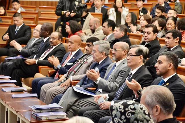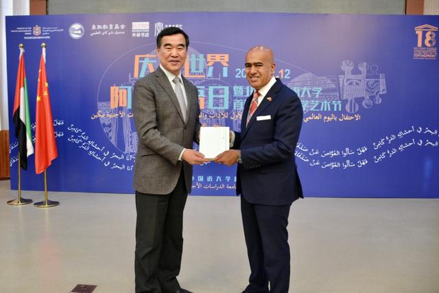 ومن جهة أخرى، ألقى السفير الإماراتي علي عبيد الظاهري كلمة خلال الاحتفال، أعرب فيها عن تقديره لجميع الجهات التي شاركت في إقامة هذه الفعالية، مشيرا إلى أن احتفال سفارة دولة الإمارات العربية المتحدة باليوم العالمي للغة العربية يتزامن مع اليوم الذي تبنت فيه الجمعية العامة للأمم المتحدة اللغة العربية باعتبارها اللغة الرسمية السادسة للمنظمة، حيث تعد اللغة العربية واحدة من اكثر لغات العالم انتشاراً، ويستخدمها أكثر من 290 مليون شخص يومياً، ومن هنا نجد اليوم فرصة جيدة لتعزيز التعاون بين الإمارات والصين باعتبار اللغة العربية ركيزة أساسية في مجالات التعاون الحضاري بين البلدين، مشيراً إلى حرص بلاده أيضاً على توسيع مجال تدريس اللغة الصينية من خلال إدراجها في 200 مدرسة في دولة الإمارات.